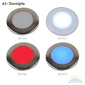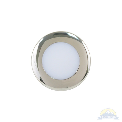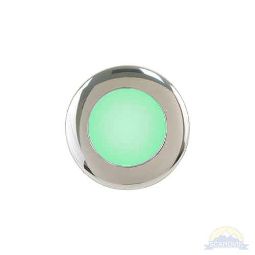 Scandvik’s A2.5 LED Down Light with class leading output, sealed weatherproof construction and simple 2-wire installation is a favorite amongst Boatbuilders. Intelligent circuitry allows color changing from White, Blue, Red, Green without specialized switches or controllers. Only a simple 2-position (on/off) toggle switch is needed. Switch light off and on again within 1.5 seconds to cycle through each of the four colors. Turning the light off for more than 1.5 seconds resets the light to White. This 316 stainless steel fixture is suitable for overhead exterior locations such as T-tops, hard tops and mezzanines. Easy to install, spring loaded butterfly clips hold the A2.5 firmly in place. Works on 12V & 24V systems.
